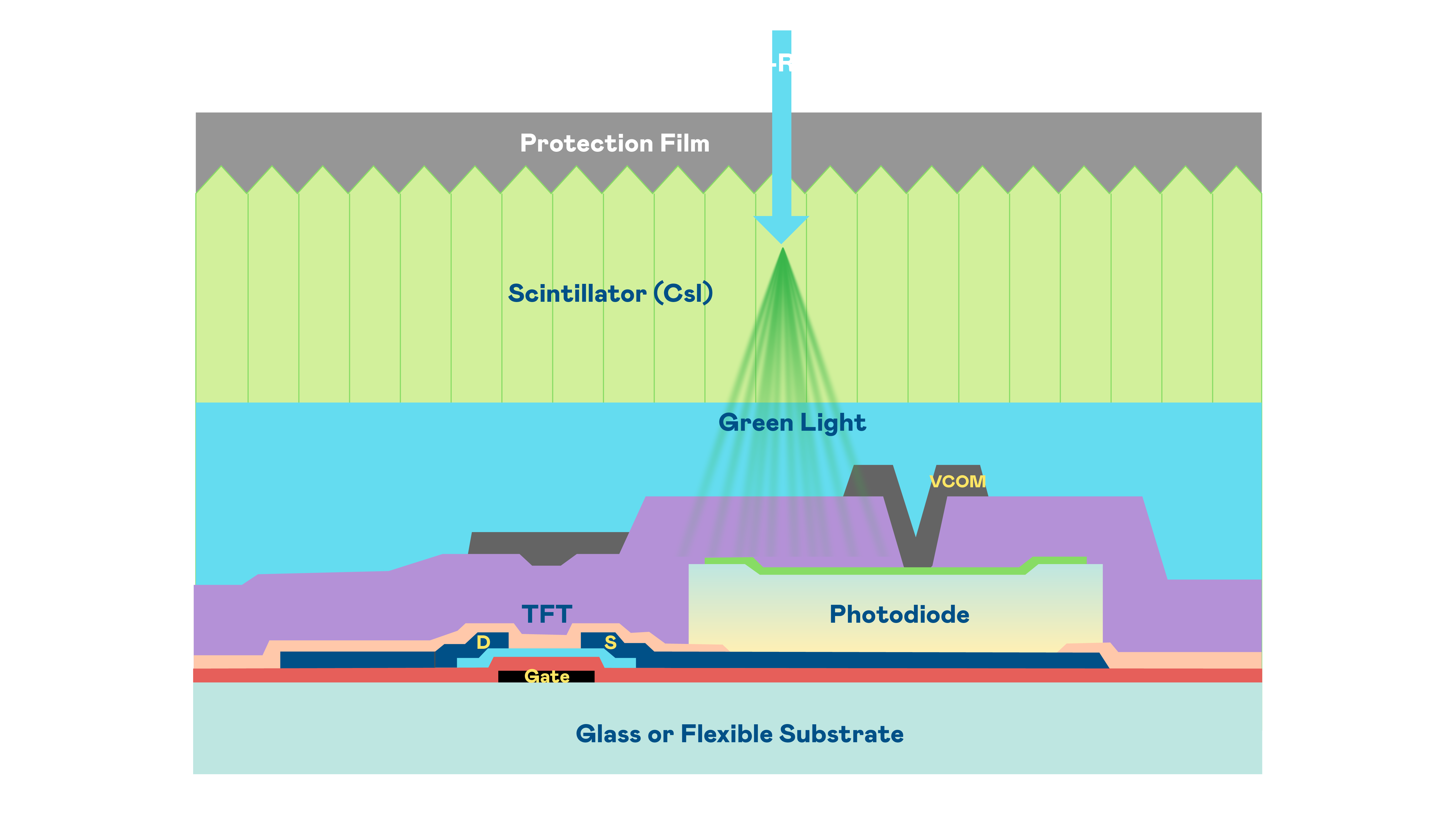 菠菜导航的X光影像感测阵列使用薄膜电晶体 (TFT) 作为每个像素的读取开关,搭配光电二极体(Photodiode)的光电转换元件,用以感测X光影像讯号。